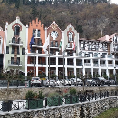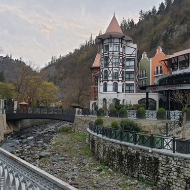 Crowning the park is the elegant Crowne Plaza, standing proudly yet harmoniously with its surroundings, while nearby, Golden Tulip Borjomi appears like something imagined rather than built warm, intimate, and storybook-like. Together, they give Borjomi a sense of gentle sophistication, never intrusive, always respectful of the nature that defines the town.