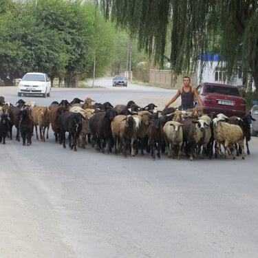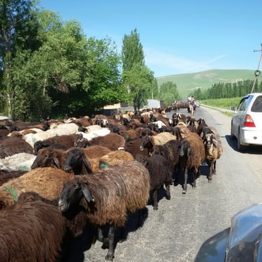 Jalal-Abad announced itself with a rainbow-colored archway - part Soviet relic, part carnival entrance - as if warning visitors: what lies beyond will defy expectations. The streets pulsed with a rhythm unchanged for generations: herds of sheep flowing like living rivers through intersections (always with right of way), their nomadic handlers cracking whips that sounded like gunshots. I learned quickly to brake for more than livestock - old men pushing carts of pomegranates, women balancing towers of fresh lepyoshka on their heads, and always, always the smell of something delicious wafting from hidden courtyards.