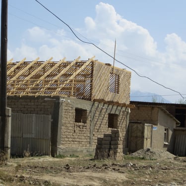 Nothing prepared me for Jalal-Abad's houses. Just beyond the bustling center, entire neighborhoods rose from the earth itself - new constructions built the old way. Mud bricks the color of cinnamon, straw protruding like whiskers, their walls thick enough to swallow summer heat and winter chill alike.