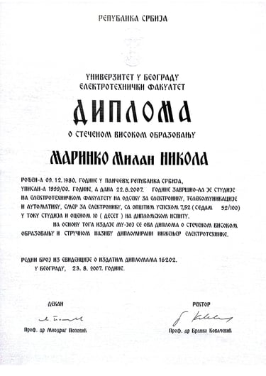 My journey into the world of electronics began at the prestigious University of Belgrade, where I didn't just earn a degree - I cultivated a lifelong passion for electrical systems that would later power my career.