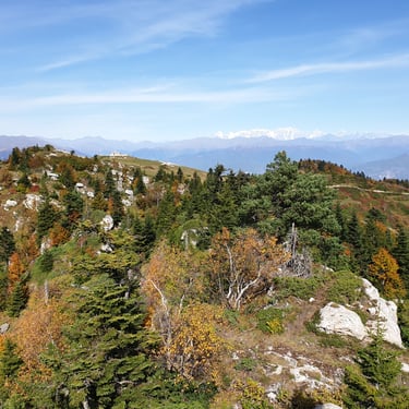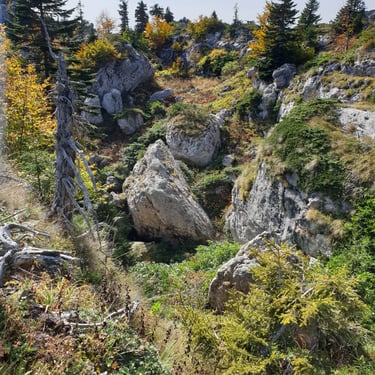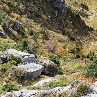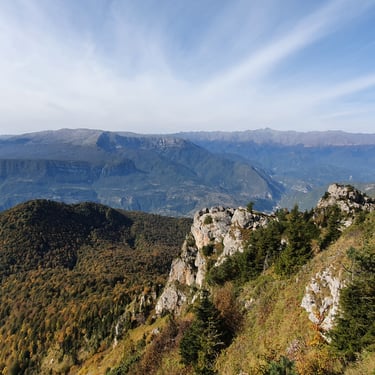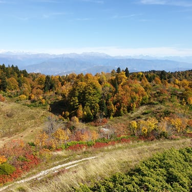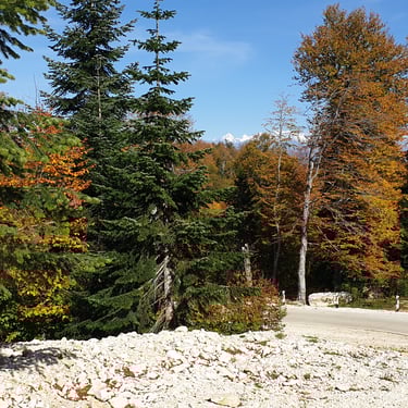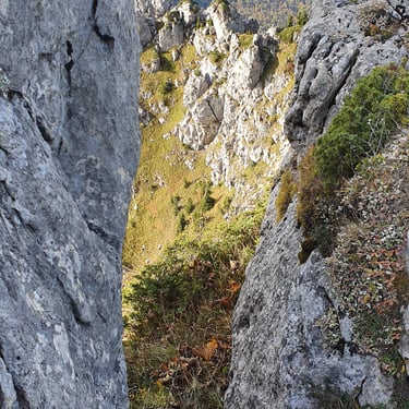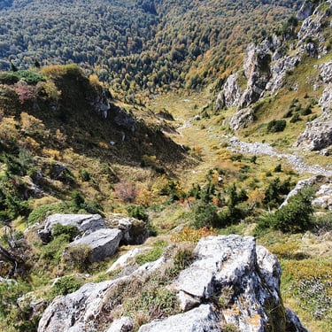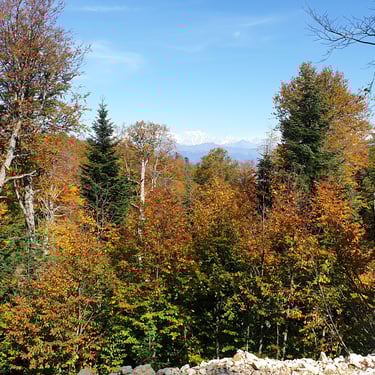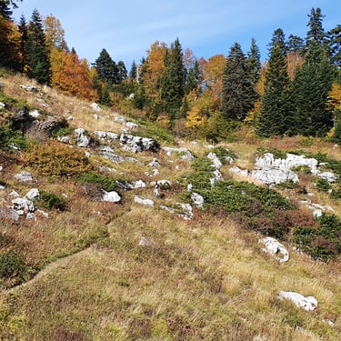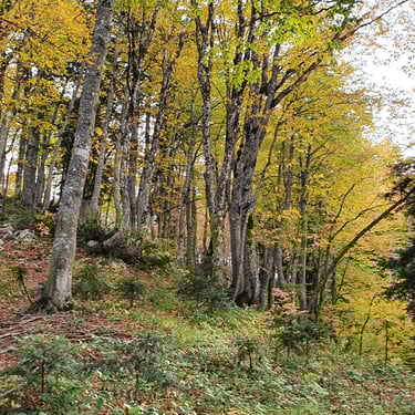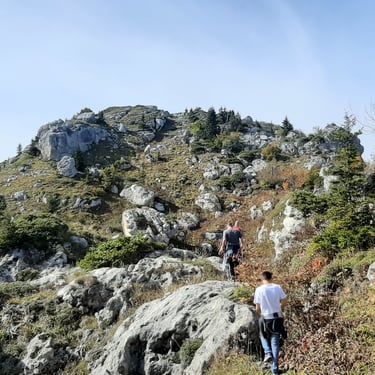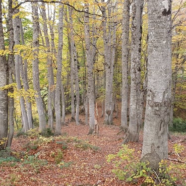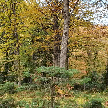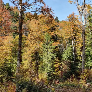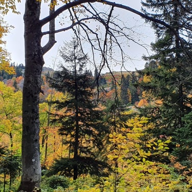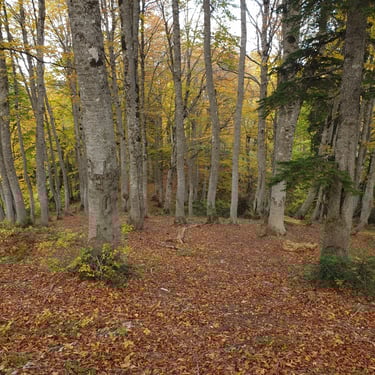 For the descent, we chose a completely different route, heading east instead of back toward the church. The forest embraced us. Dry leaves blanketed the ground, cushioning our steps. Tall trees rose around us, their branches painted in autumn’s finest tones. The sound of leaves crunching beneath our boots became the rhythm of our return.